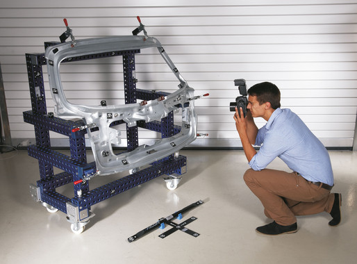首先,在測量物件的特征部位貼上標記點或裝上適配器。適配器可專門用于測量鉆孔、邊緣等位置,也有專門用于參考點的測量。同時,對剪切線及沖孔等位置可以直接測量,無需額外定位。然后,使用高分辨率數(shù)碼相機從不同角度對測量物體進行拍攝,確保所有重要的物體部位都已被捕捉。